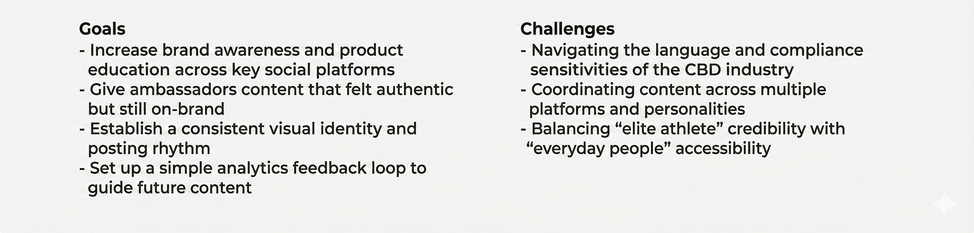 Defined content pillars: performance & recovery, CBD education, ambassador stories, and community/UGC